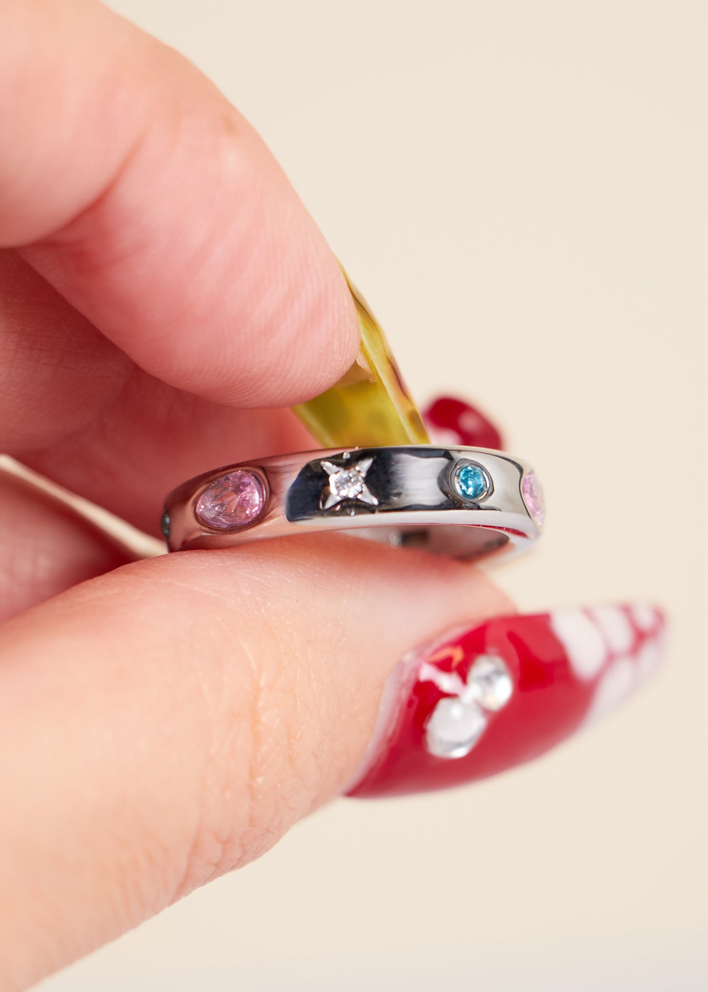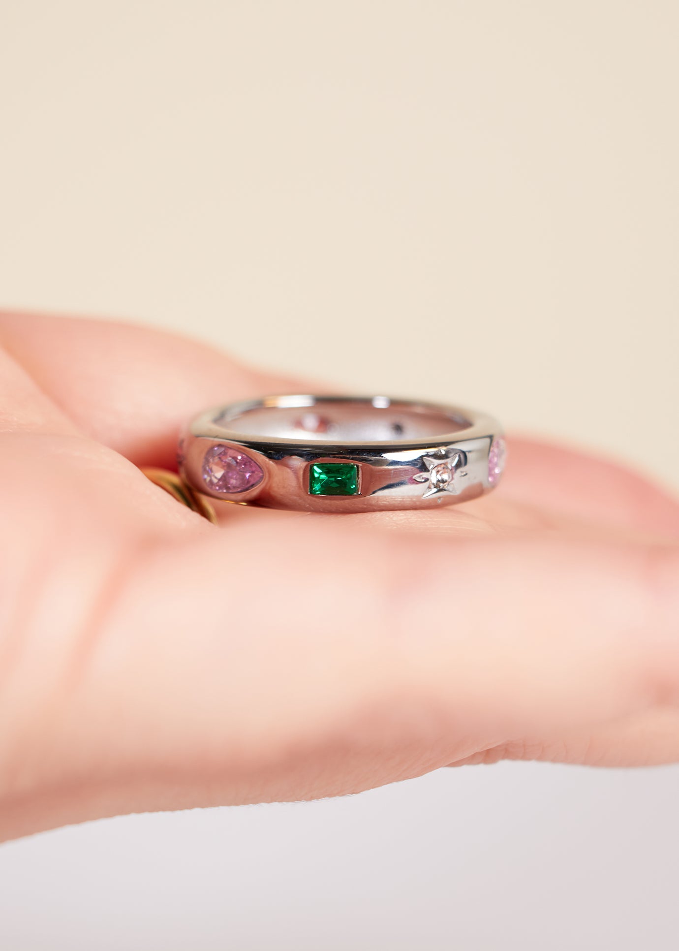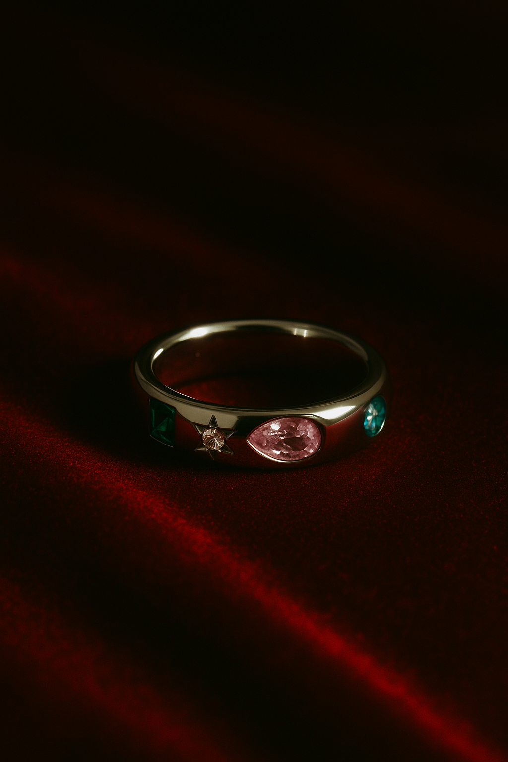 A circle of endless stories. Stainless steel set with multi-coloured stones, each one a sparkling excuse — scattered like secrets you’ll never confess.